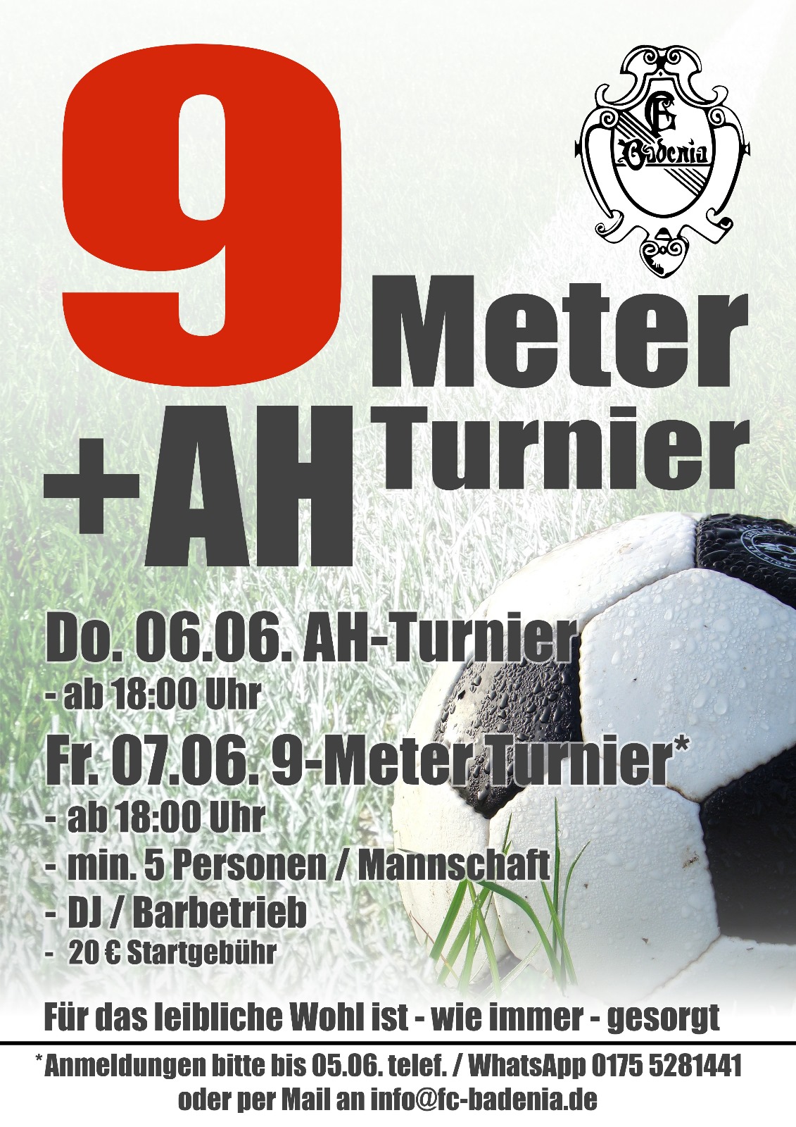 Am Donnerstag, 06.06. und Freitag den 07.06. finden die Sporttage beim FC statt. Am Donnerstag findet ab 18 Uhr das traditionelle AH-Turnier statt. Am Freitag laden wir alle Interessierten Vereine, Gruppen, Straßen, Firmen usw. zum Neunmeterschießen ein. Los geht´s hier auch ab 18 Uhr. Anmeldungen sind per Mail unter
