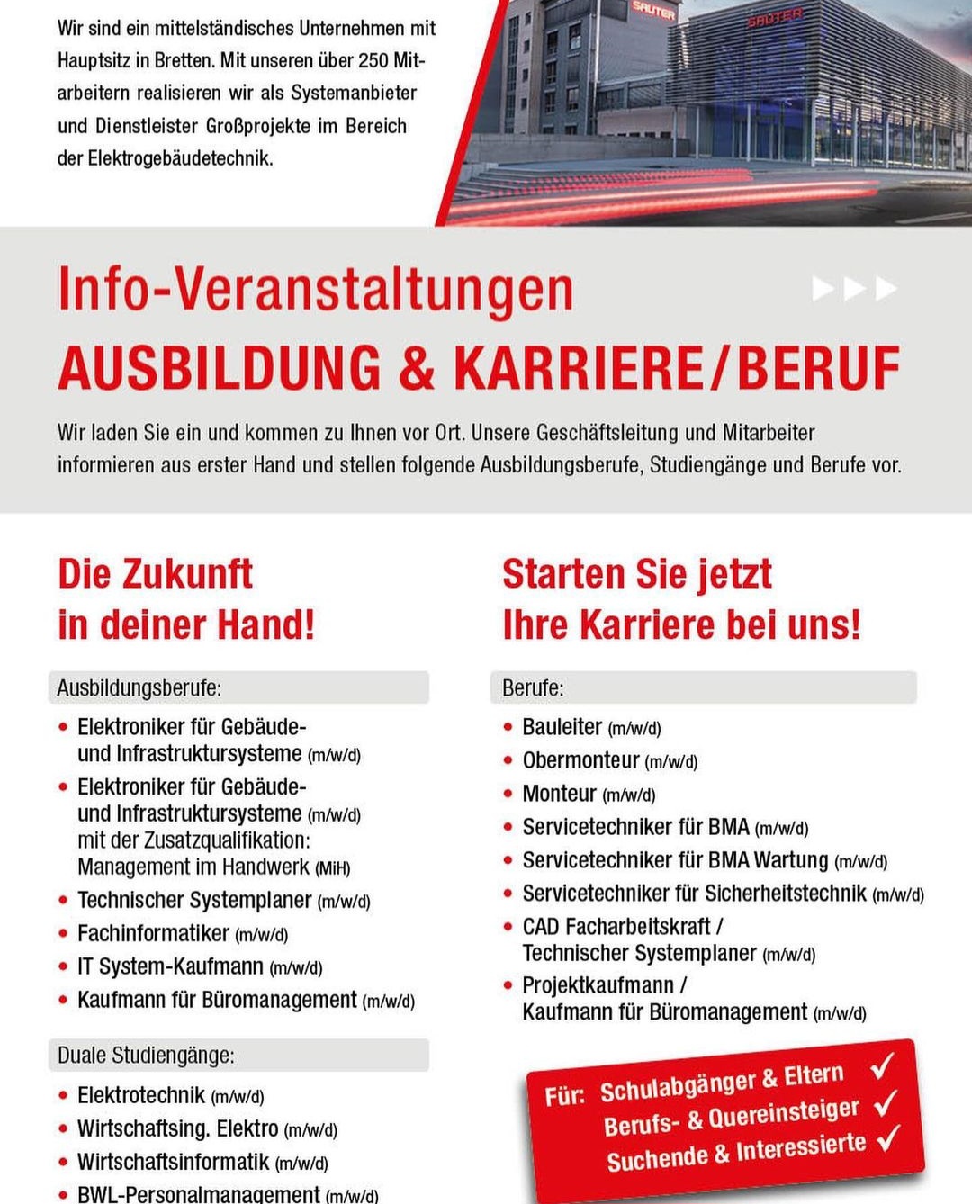 Am Donnerstag, den 30. November veranstaltet der FC Badenia Rohrbach 1920 e.V. gemeinsam mit seinem Kooperationspartner, der Fa. Sauter Elektrotechnik in Bretten eine Informationsveranstaltung rund um das Thema Ausbildung & Beruf/Karriere. Die Veranstaltung beginnt um 18:30 Uhr und findet natürlich im FC Clubhaus statt. Wir laden alle Interessierten Rohrbach Jugendliche an, sich über Möglichkeiten rund um die Berufsausbildung bei der Fa. Sauter zu informieren. Selbstverständlich geht die Einladung auch an alle Eltern und Interessierten. Wir freuen uns über ein volles Clubhaus. Für das leibliche Wohl wird gesorgt sein.
